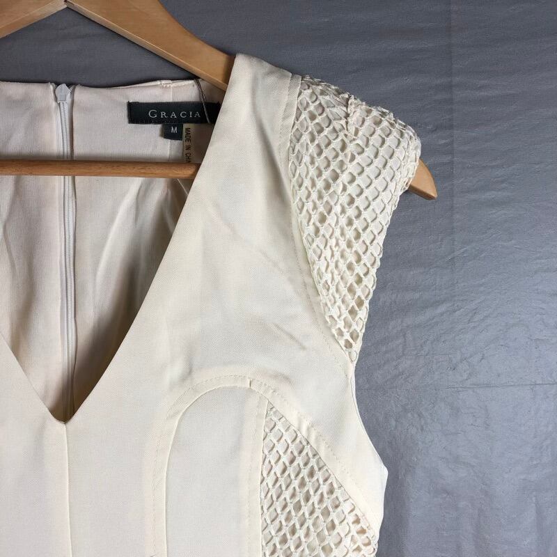 グラシア GRACIA ワンピース ミニワンピース ノースリーブ Vネック メッシュ編み 裏地付き タグ付き 肩パッド 白 クリーム色系 Mサイズ 2025032100083