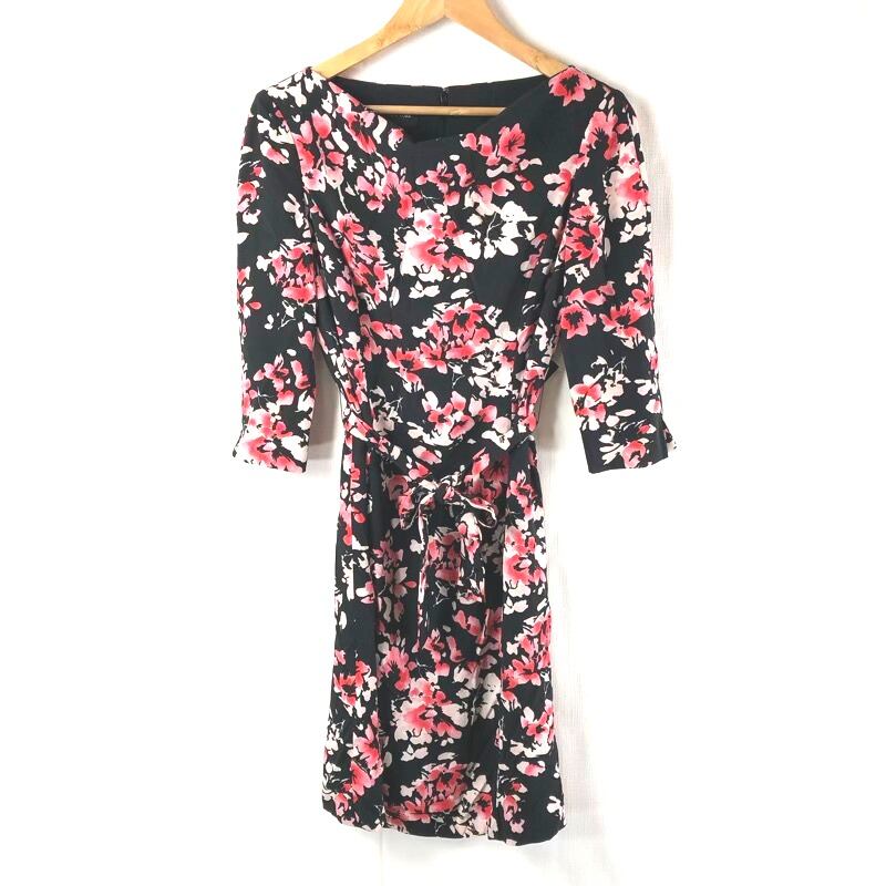 ジョーンズニューヨークドレス JONES NEW YORK DRESS ワンピース 長袖 花柄 リボン紐 スリット 裏地付き タグ付き ピンク 黒系 4サイズ 2025032500012