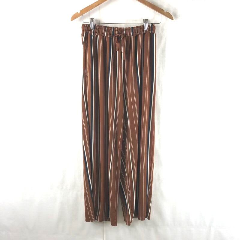 パンツ ワイドパンツ イージーパンツ ストライプ リボン紐 ウエストゴム ブラウン系 Lサイズ 2025052700423