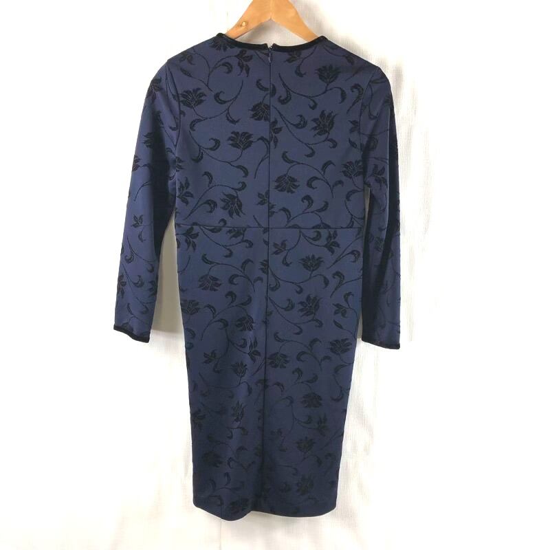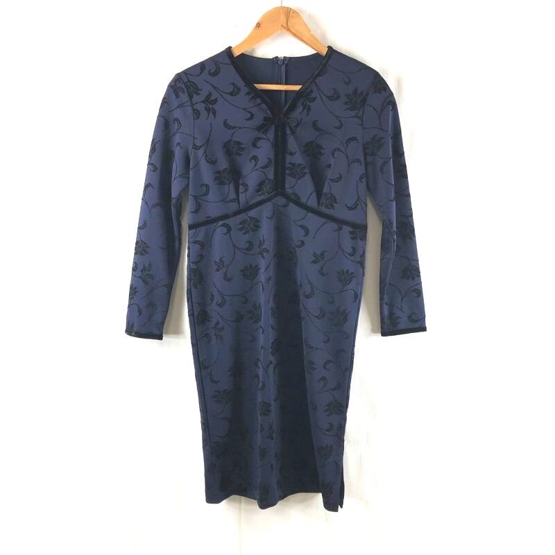 ワンピース 長袖 Vネック リボン ベロア 花 植物 模様 スリット裾 組成表示タグなし ネイビー系 2025052700560