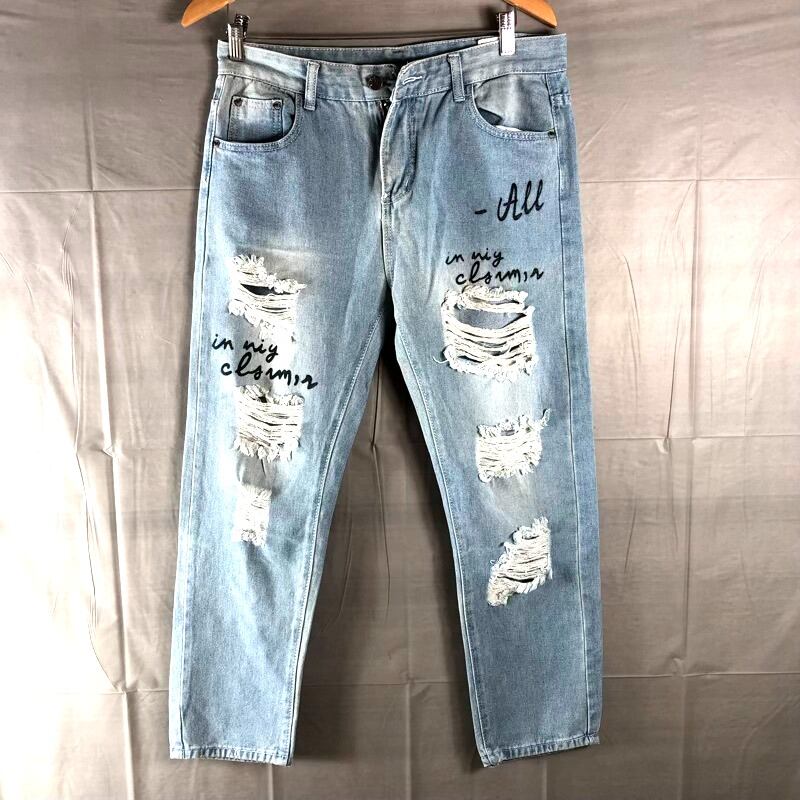 デニムパンツ ダメージ加工 ペイントプリント テーパード ライトブルー ブルー系 32サイズ 2025061100238