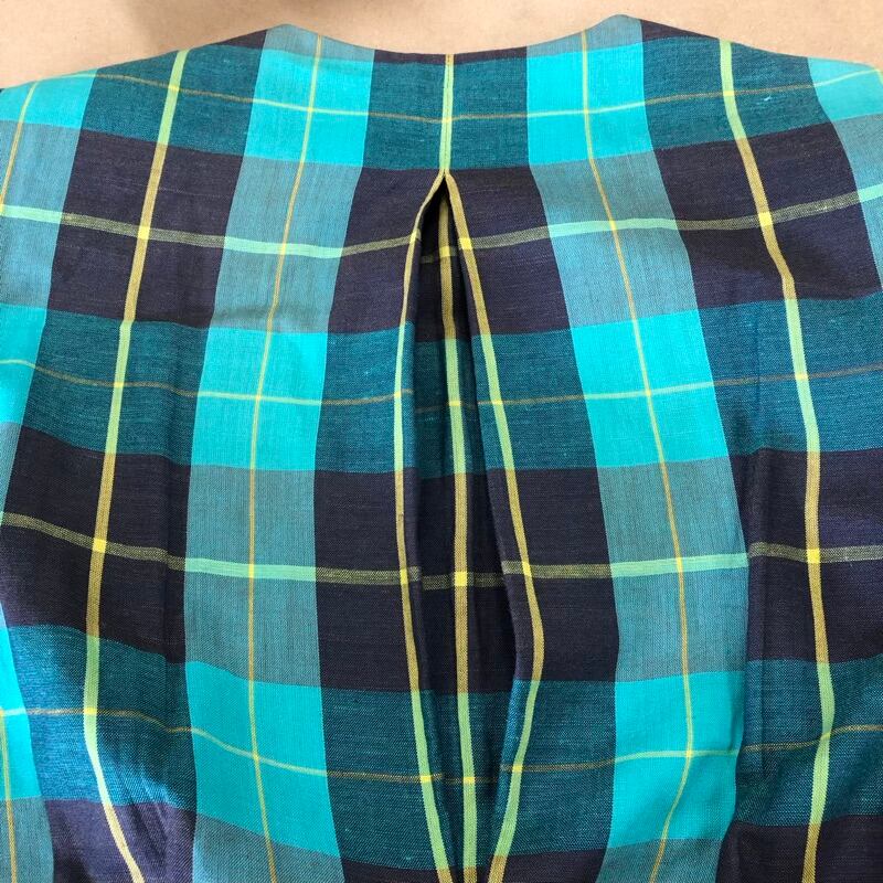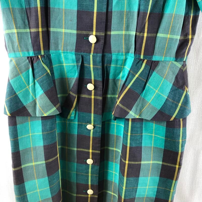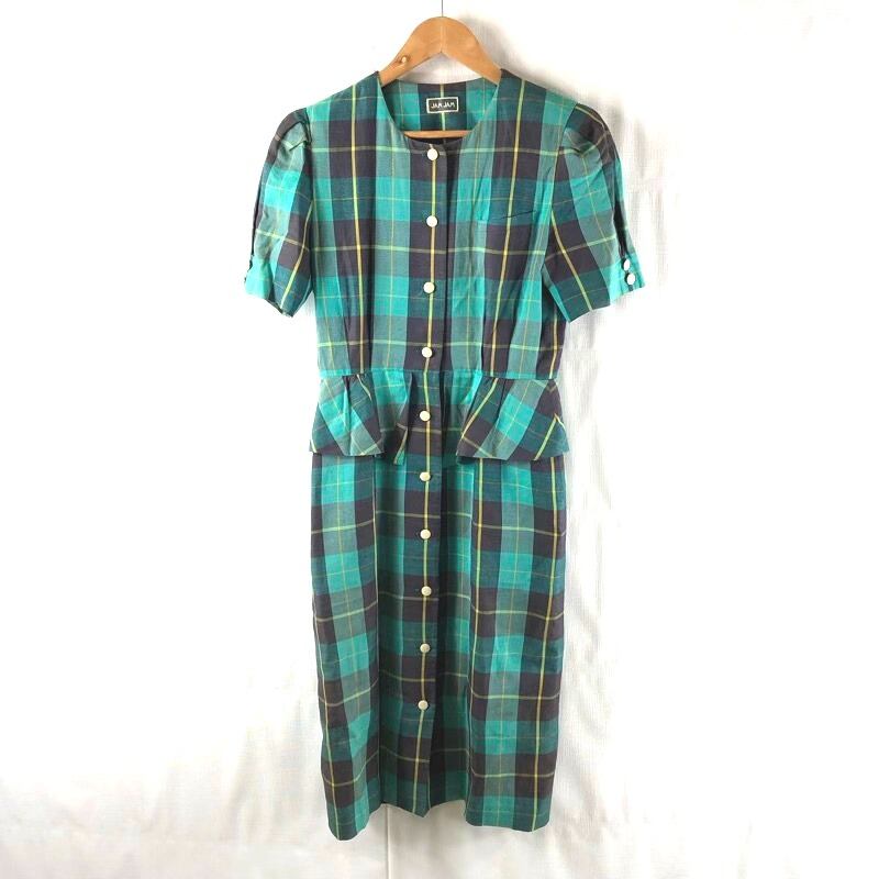 JAM JAM ワンピース ロング 半袖 チェック柄 フリル ボタン ポケット 肩パッド 裏地付き 緑系 2025062700093