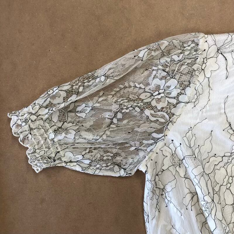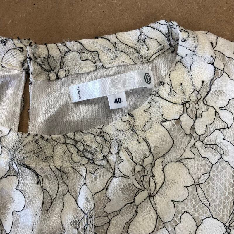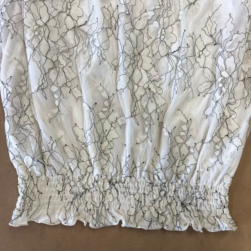 ブラウス 半袖 花柄刺繡 レース シースルー パフスリーブ 裾リブ ゴールドボタン ホワイト系 オフホワイト 40サイズ 2025070900102