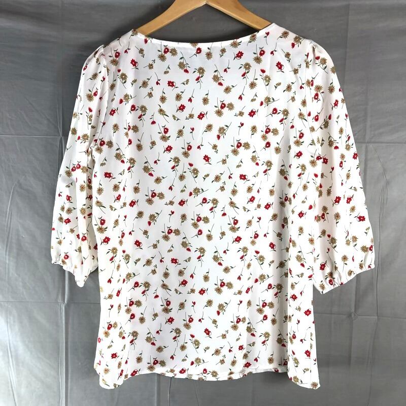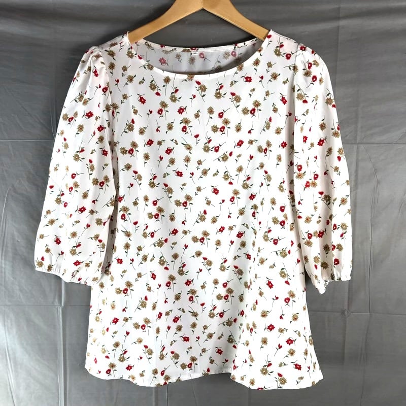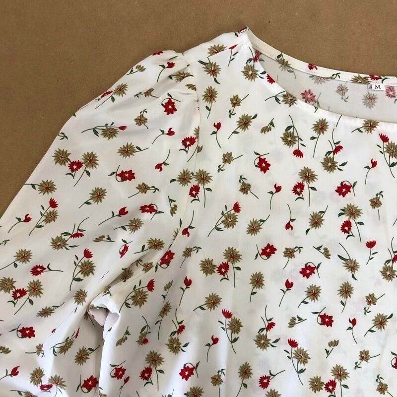 ブラウス 小花柄プリント ボートネック パフスリーブ 七分袖 とろみ素材 クリーム系 ホワイト系 Mサイズ 2025070900119