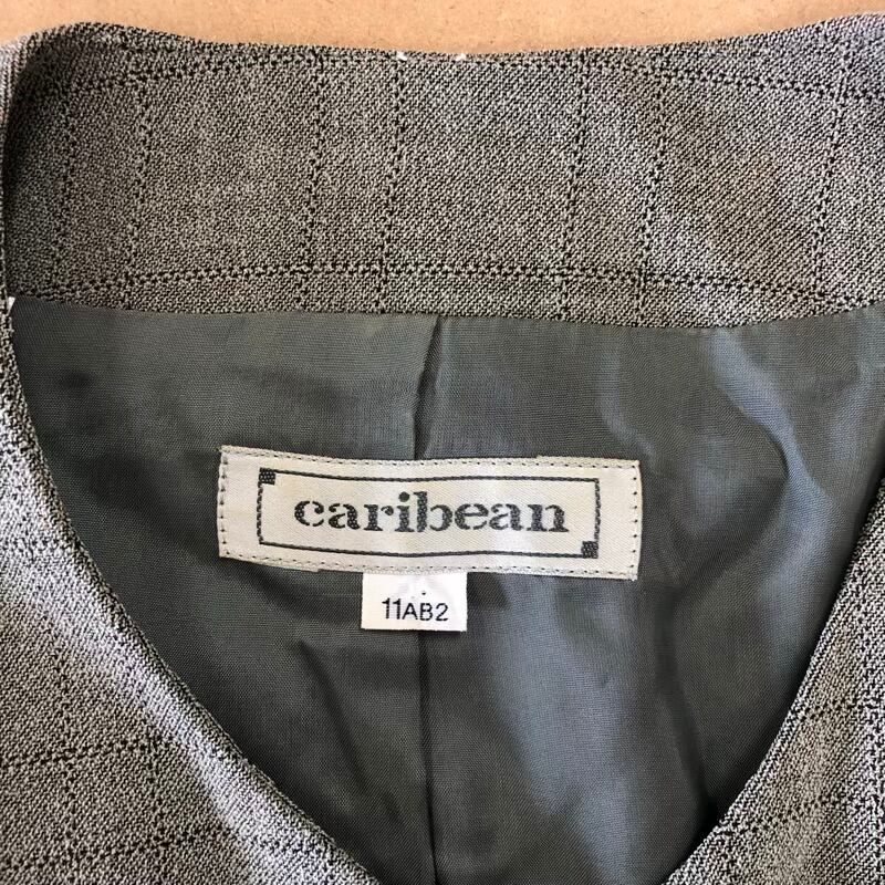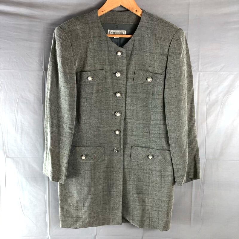 カリビアン caribean ジャケット ノーカラー チェック ビジューボタン フロントポケット 肩パッド 裏地付き 日本製 グレー 11AB2サイズ 2025071800074