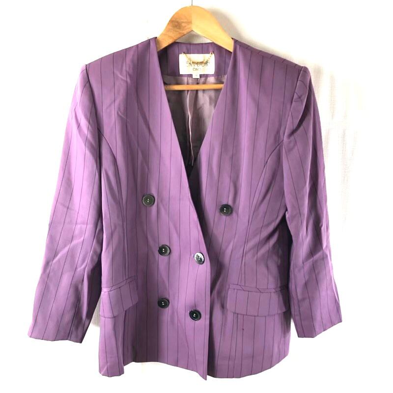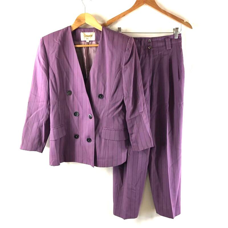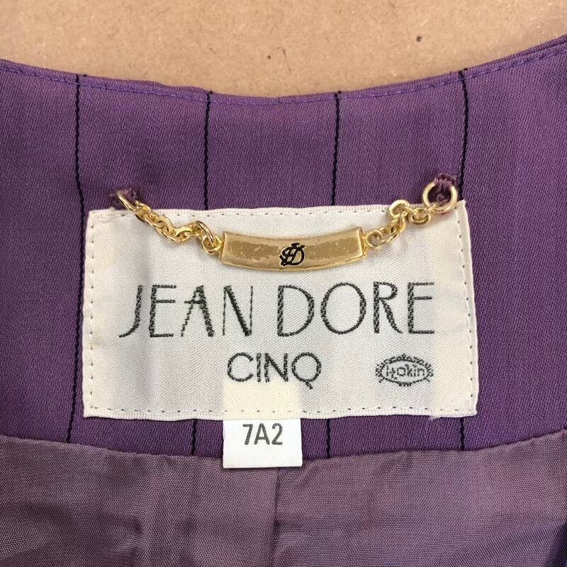 JEAN DORE Cinq スーツ ノーカラージャケット パンツ チャーム付き ストライプ 肩パット 紫 2025081600138