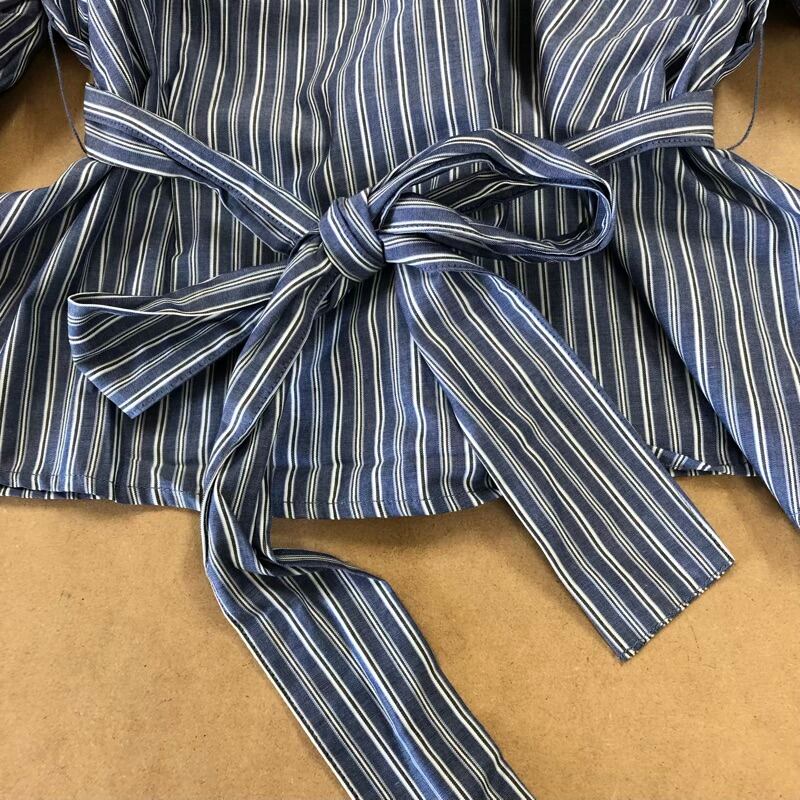 ジーユー GU カットソー ストライプ リボン紐 綿100% ボタン くすみブルー系 Lサイズ 2025082700370