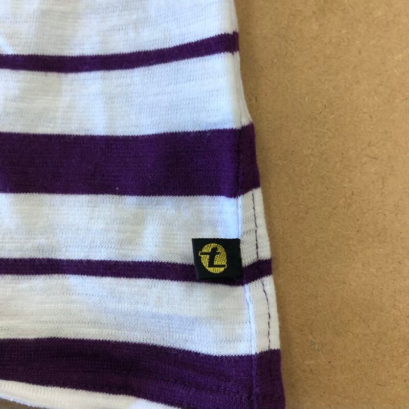 T comme ca Tシャツ 半袖 ボーダー Vネック 胸元ワンポイント刺繍 紫 白 Lサイズ 2025082900114