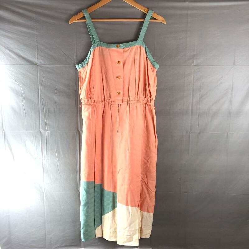 ワンピース キャミソール ロング 裏地付き ファスナー 金ボタン ウエストゴム入り 綿100% サーモンピンク ミントグリーン ベージュ 13号サイズ 2025082900350