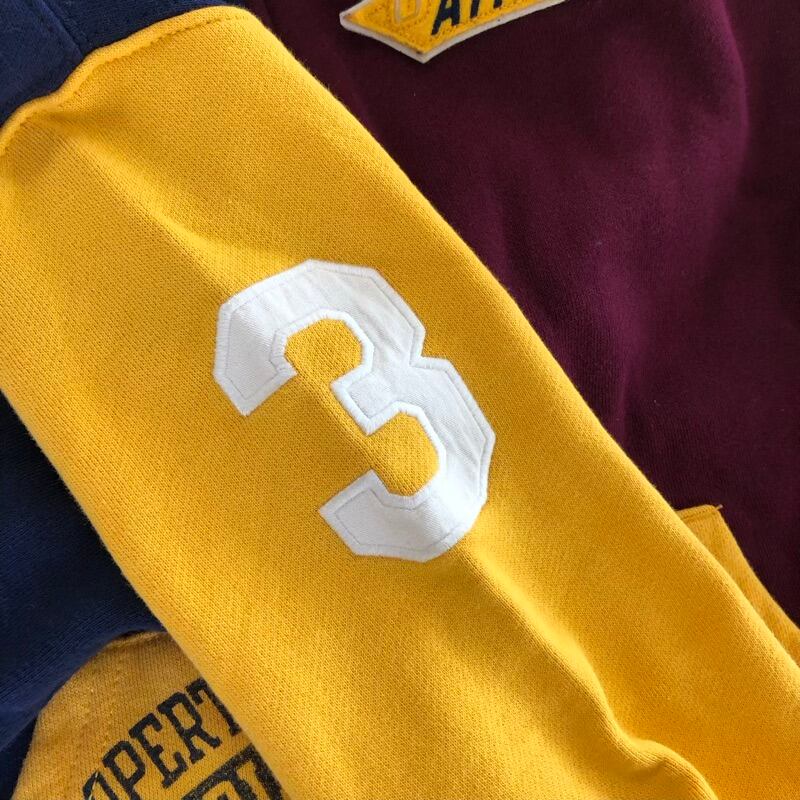 ポロラルフローレン POLO RALPH LAUREN パーカー 配色デザイン ワッペン 英字 フード リブ 紺 ボルドー 黄色系 Mサイズ 2025083000288
