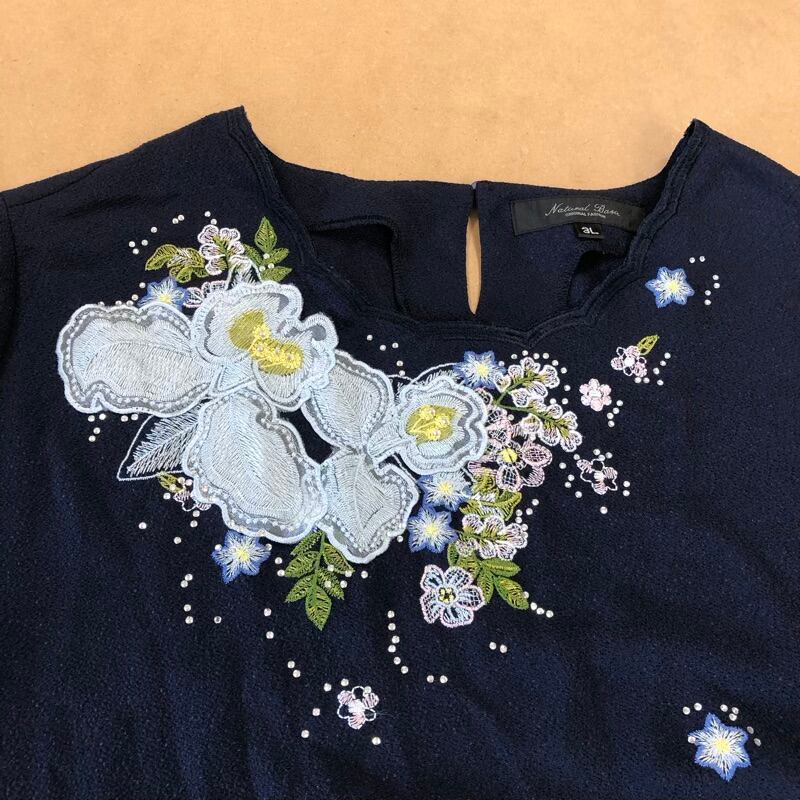 ナチュラルベーシック NaturalBasic チュニック 花 刺繍 ラインストーン レース スカラップカット ネイビー系 3Lサイズ 2025083000417
