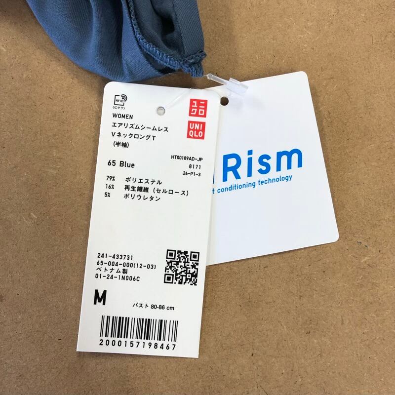 ユニクロ UNIQLO Tシャツ ロング 半袖 Vネック エアリズムシームレス タグ付き ブルー くすみブルー系 Mサイズ 2025090200220