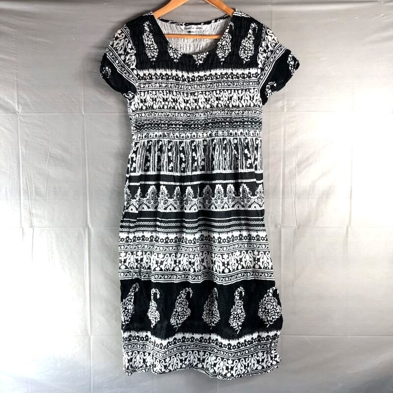 フラワーラングエッジ Flower Language ワンピース 柄プリント インド綿 裏地付き ブラック系 ホワイト系 M-Lサイズ 2025092000170